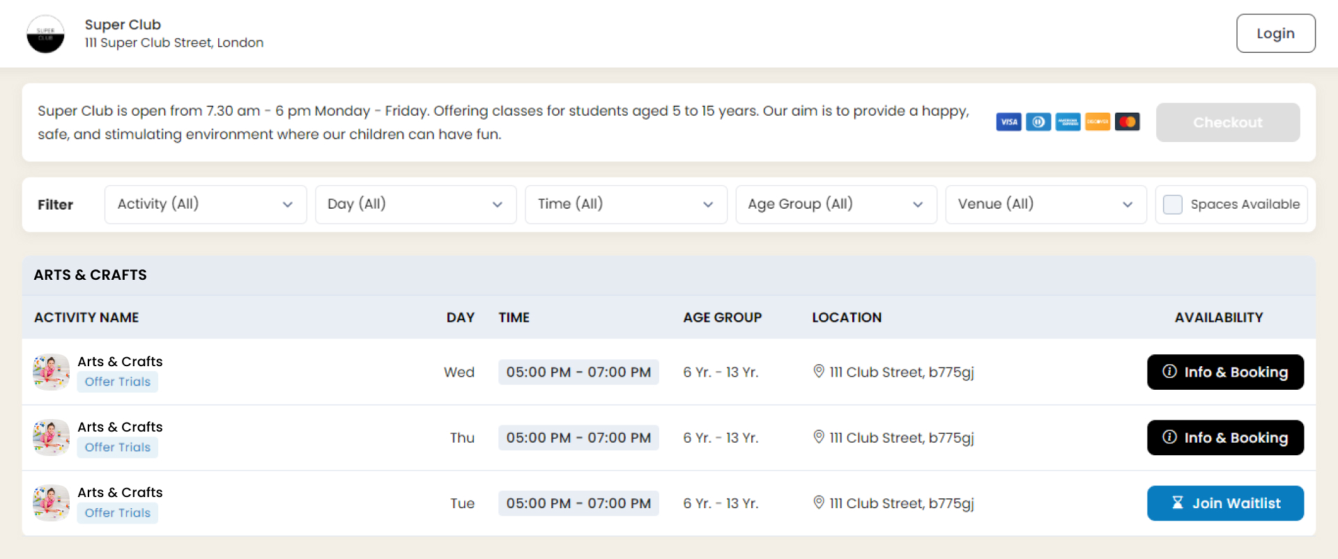 Get StartedCustomize your arts and crafts club's registration forms to align with your business branding. Our arts and crafts club registration software is a powerful tool that allows your customers to manage their registrations efficiently, update their information, and register siblings at your arts and crafts club.